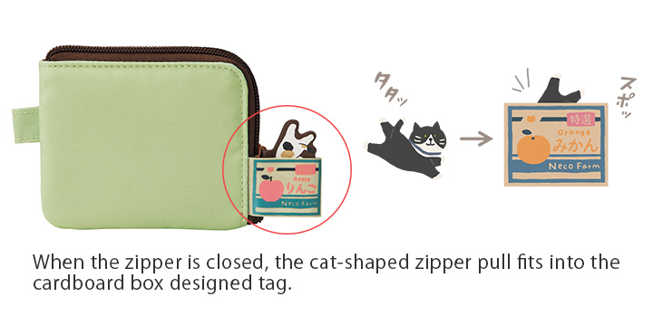 Featuring a large L-shaped zipper that opens wide, When the zipper is closed, the cat-shaped zipper pull fits into the cardboard box designed tag.