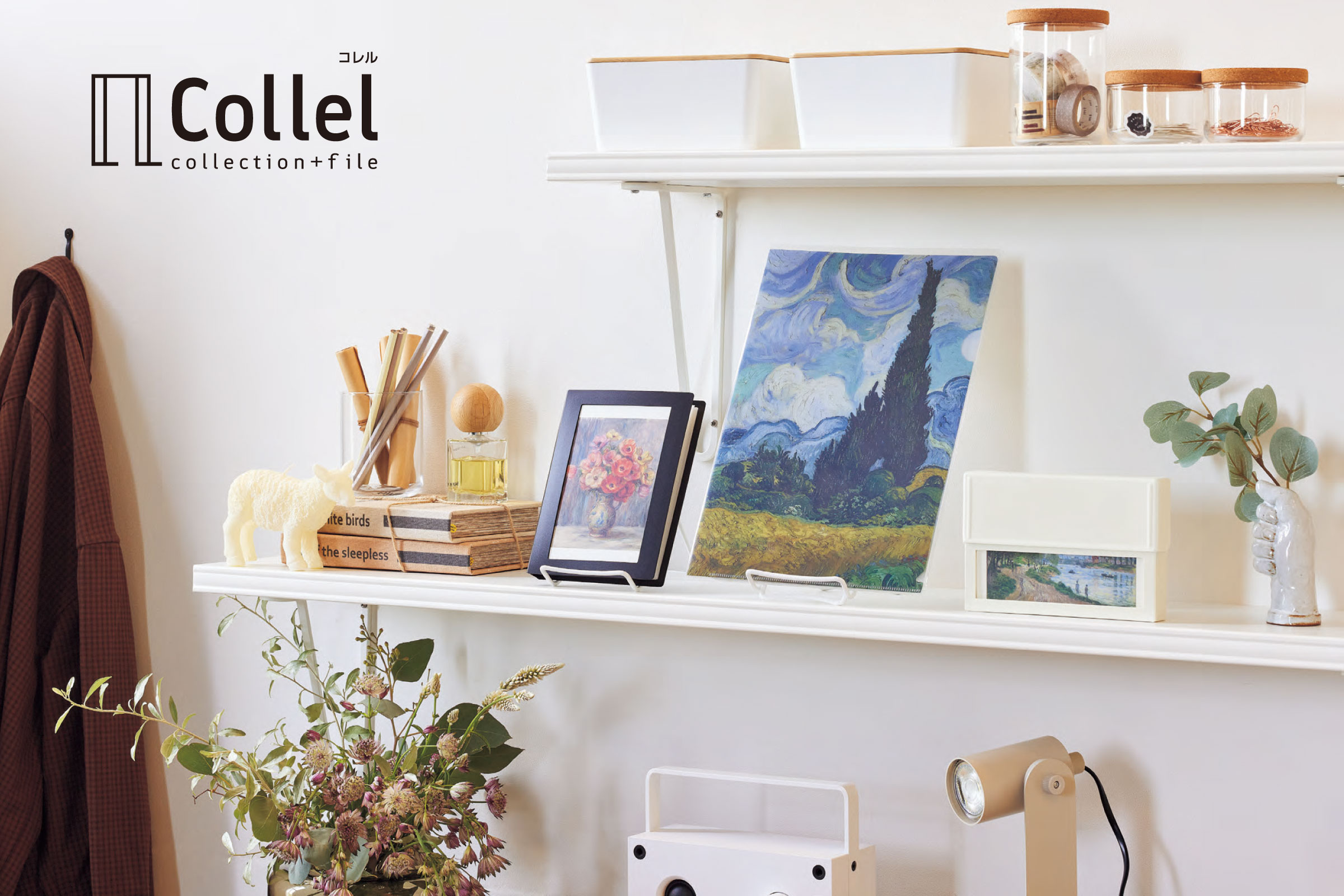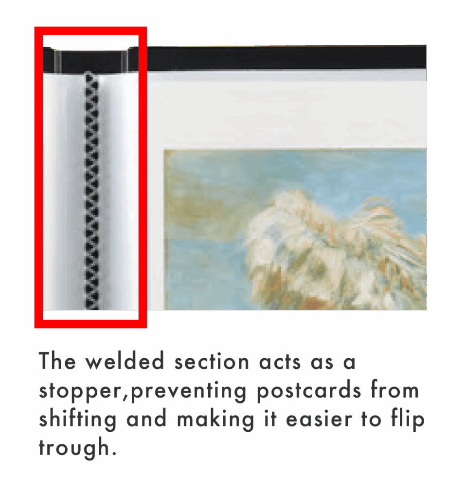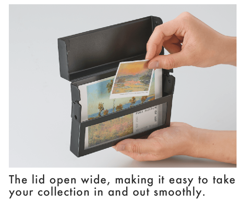 Windowed case for storing postcards and stickers.