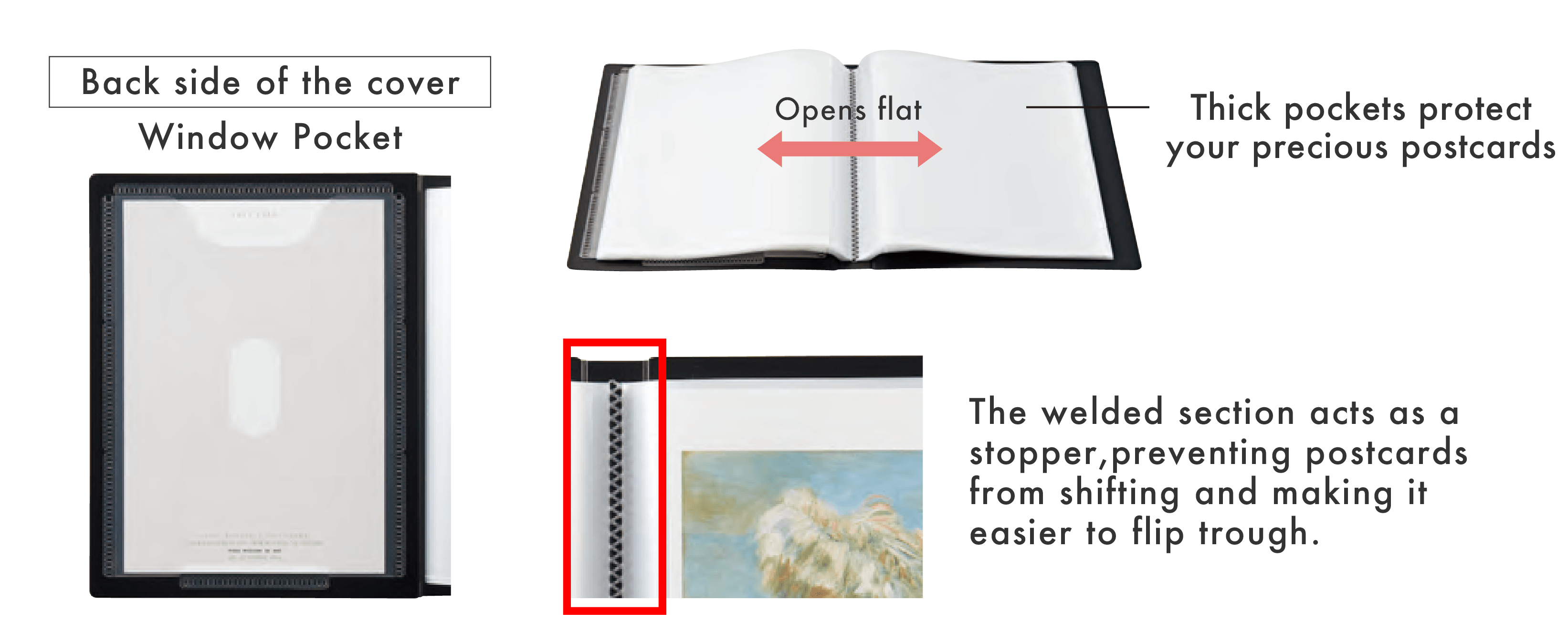 Windowed album where you can display your favorite postcard on the cover.